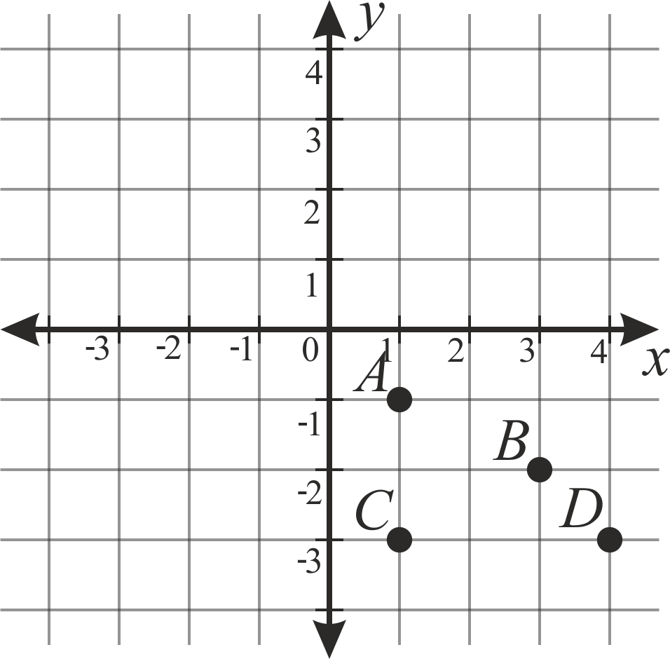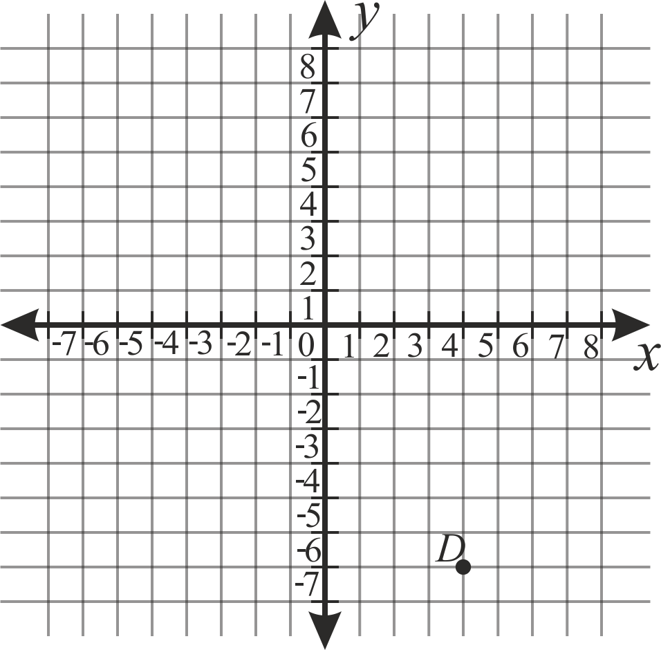$D$ is 4 units to the right of and 3 units below the origin so point $D$ is $(4,-3)$